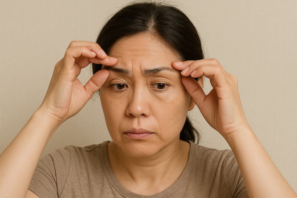 この状態になると、見た目に影響が出るだけでなく、視界が狭くなり、目を大きく開けようとして額や眉に力が入りやすくなります。